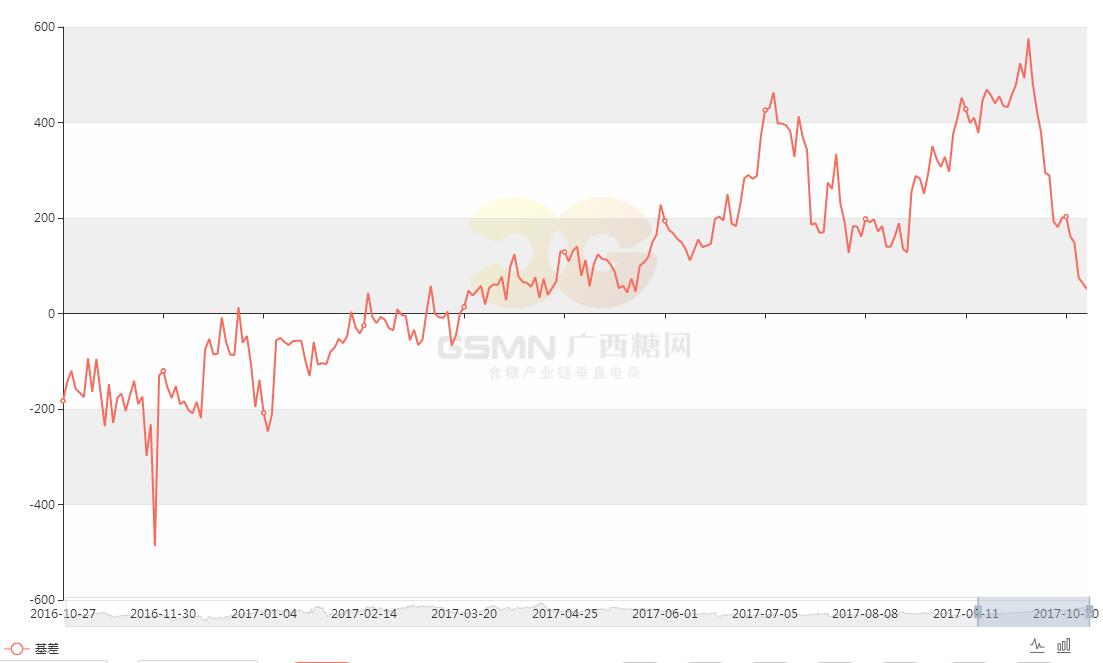 從預計10月底廣西集團庫存情況看,10月底預計集團庫存合計為18-20萬噸左右。假如11月中下旬廣西只有5-7家糖廠開榨,11月底之前廣西的庫存同樣相對緊張,但傳廣西11月開榨10家糖廠左右,預計產糖5-8萬噸,關鍵看11月份廣西實際開榨糖廠的數量。后期變量在于,11月——12月廣西能產多少糖以及隨著甜菜糖的大量上市能否降價給出注冊倉單的空間,使得SR1801合約多頭軟逼倉預期破滅SR1-5價差再次縮小。