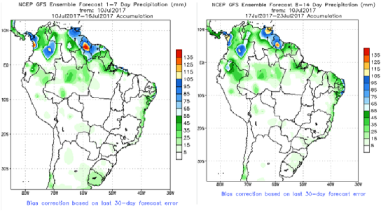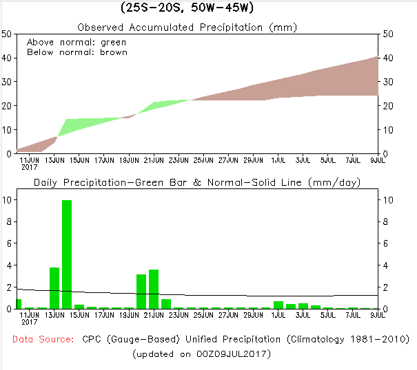 從巴西中南部的降雨來看,除了下半月前期的幾天有降雨外,其他后面幾天降雨稀少,有利于巴西中南部蔗區(qū)的生產(chǎn)工作。而7月10日至23日的降雨量較少,依舊是有利于巴西中南部的甘蔗壓榨工作。