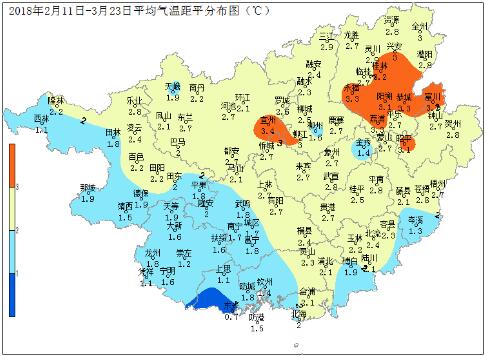 圖2 2月11日—3月23日平均氣溫距平分布圖