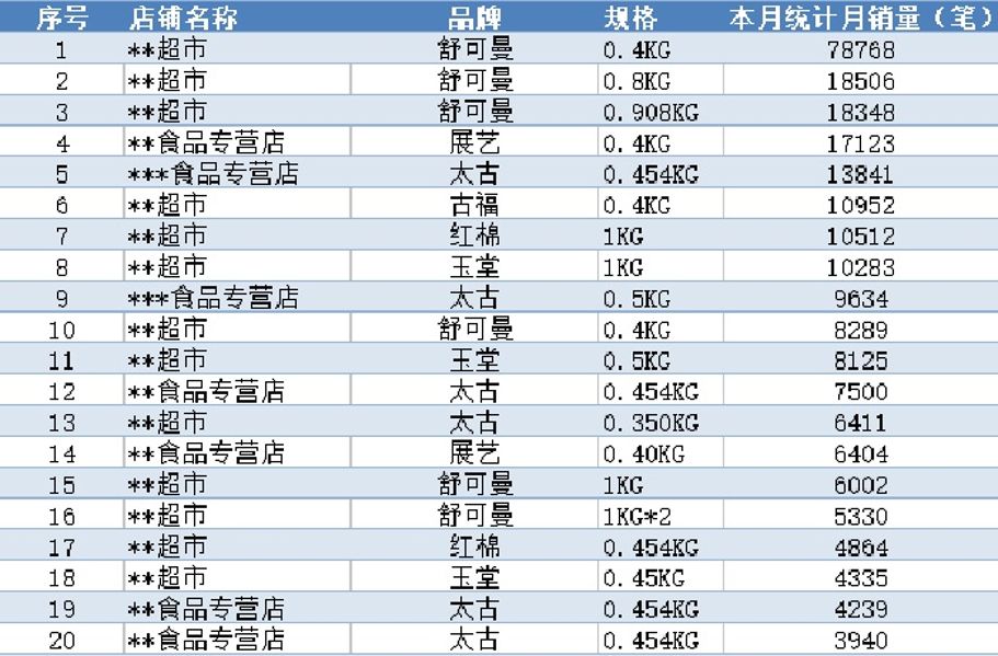 5.網上銷售數據顯示白糖銷售量趨向穩定發展。工業用糖是食糖消費的主力,但民用食糖消費也是不可缺少的一部分。在食糖零售方面,網上購買也成為大眾普遍使用的一種方式,看(下圖2)網上銷售數據(數據選取了淘寶天貓網上商城銷量靠前的店鋪),可以看出,網上食糖銷售保持平穩增長,借古語所說“不積跬步無以至千里,不積小流無以成江海”,民用食糖消費量雖不大,但其也是每年1500萬噸左右食糖消費的重要貢獻力量。