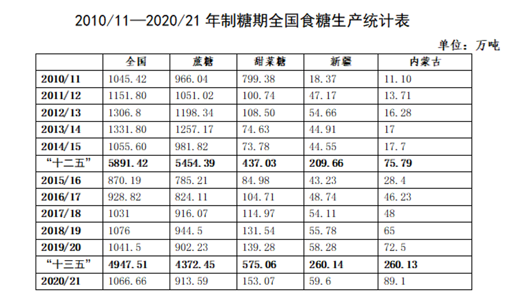 ——“南糖北移”遭遇糧食安全戰(zhàn)略阻擊,內(nèi)蒙古和新疆難堪國家食糖安全大任。由于土地資源優(yōu)勢,“十三五”以來,以內(nèi)蒙古為代表的北方甜菜糖進(jìn)入快速發(fā)展期,占全國食糖的比重快速提升,在業(yè)界形成“南糖北移”“新認(rèn)識”?!笆濉睍r期,內(nèi)蒙古累計產(chǎn)糖260.13萬噸,比“十二五”時期累計增長243.22%,占北方甜菜糖的比重達(dá)到45.24%,比“十二五”時期提高9.09個百分點。在內(nèi)蒙古甜菜糖快速發(fā)展的帶動下,“十三五”時期北方甜菜糖累計產(chǎn)量575.06萬噸,比“十二五”時期累計增長31.58%,占全國同期食糖總產(chǎn)量的11.94%,比“十二五”時期提高4.52個百分點(詳見“2010/11—2020/21年制糖期全國食糖生產(chǎn)統(tǒng)計表”)。