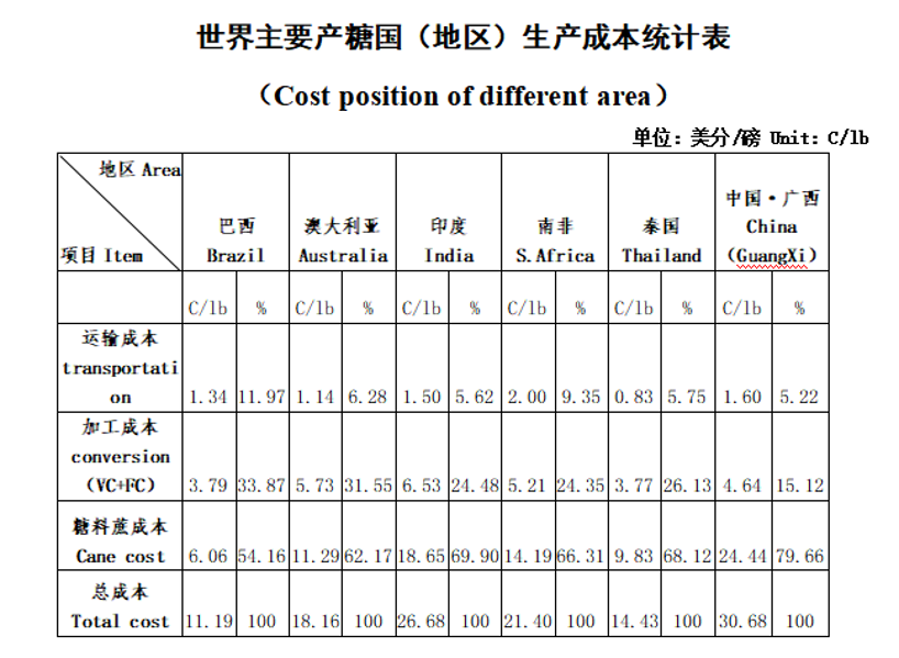 “十三五”時期以來,廣西糖料蔗生產(chǎn)成本進(jìn)一步上升,與國外的差距進(jìn)一步擴(kuò)大。根據(jù)國內(nèi)有關(guān)機(jī)構(gòu)提供的近三個制糖期廣西與巴西、澳大利亞、泰國3國糖料蔗收購價格數(shù)據(jù)顯示,三個國家的糖料蔗到廠成本折合人民幣均不超過200元/噸,而廣西糖料蔗平均到廠成本(含運費)約530元/噸,成本差由2014/15年制糖期的2.04倍,擴(kuò)大到2.65倍以上。按照8噸甘蔗生產(chǎn)1噸糖計算,廣西噸糖生產(chǎn)成本僅原料蔗一項,就比對方高2600元以上,毫無國際競爭力可言?!笆奈濉睍r期,我國糖業(yè)必須通過規(guī)?;C(jī)械化、水利化和良種良法種植,提高糖料蔗單產(chǎn)和糖分,降低生產(chǎn)成本。