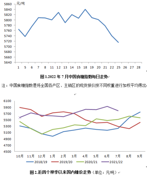 國內食糖消費旺季不旺,美國加息預期致使全球商品大跌,國內外糖價走勢均受外圍市場宏觀因素拖累。7月20日前,國內糖價受基本面支撐有較強的反彈需求,20日后國內糖價沖高回落,主要是受國際糖價下跌影響。7月國內食糖均價穩中有跌為5790元,環比跌135元,跌幅2.3%;同比漲276元,漲幅5.0%。本月每日國內糖價走勢見圖1。