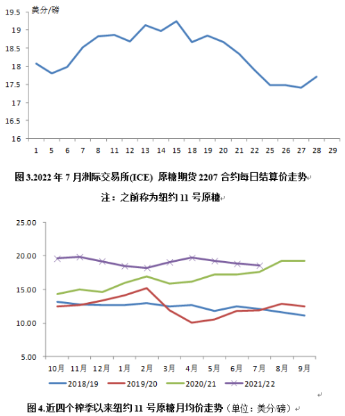 受巴西食糖產量高于預期,擔憂全球經濟陷入衰退、大宗商品市場彌漫負面情緒,巴西下調汽油價格、糖廠將增加食糖生產、雷亞爾走弱,原油價格疲弱以及美元走強等因素影響,7月國際糖價(洲際交易所11號原糖期貨均價,下同)小幅下跌為每磅18.57美分,環比跌0.26美分,跌幅1.4%;同比漲0.96美分,漲幅5.5%。本月每日國際糖價走勢見圖3。