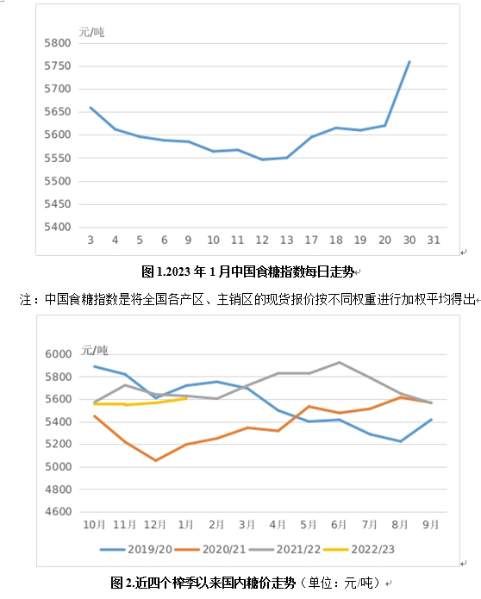 由于市場食糖供應充足,春節備貨基本結束,新年前兩周(3-13日)國內糖價呈下跌走勢。春節前一周(16-20日),受國際糖價震蕩走高影響,國內糖價止跌略漲。春節期間國內旅游復蘇、國際糖價大漲,節后國內糖價迎來了開門紅。1月國內食糖均價為5605元,環比漲38.31元,漲幅0.69%;同比跌23元,跌幅0.4%。本月每日國內糖價走勢見圖1。