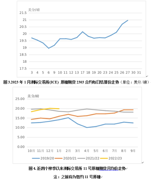 截至2022年底,本榨季印度、泰國食糖產量增長,巴西政府的燃料政策也更傾向于鼓勵糖廠生產食糖,疊加原油價格大幅回落,導致新年第一周國際糖價持續下跌,之后漲跌互現。25-30日,受巴西油價上調、印度出口緊張、基金買盤推動等因素影響,國際糖價持續上漲。1月國際糖價(洲際交易所11號原糖期貨均價,下同)持平略跌為每磅19.85美分,環比跌0.17 美分,跌幅0.8%;同比漲1.36美分,漲幅7.4%。