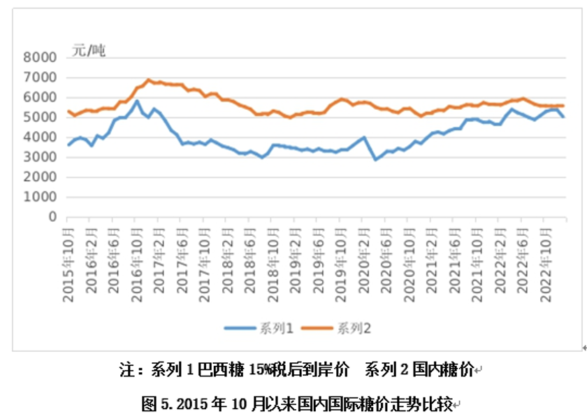 由于國際食糖稅后到岸價持平略降、國內糖價持平略漲,國內外價差大幅擴大。1月份,配額內15%關稅的巴西食糖到岸稅后價每噸5027元,環比跌325元,跌幅6.1%,比國內糖價低577元,價差比上月擴大364元。