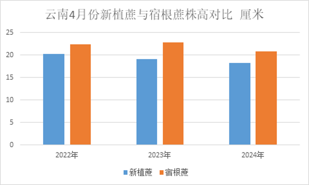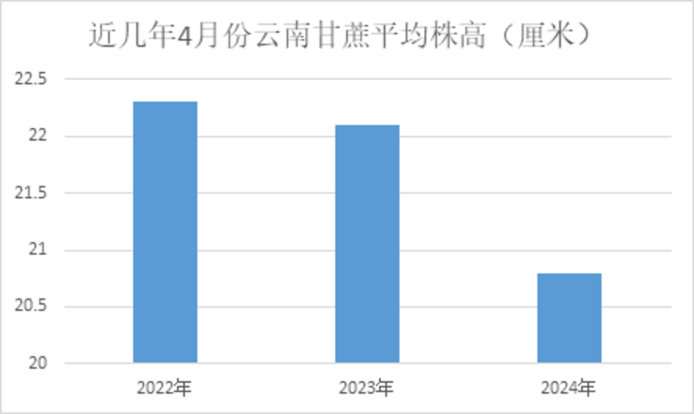 四月云南的調研數據看,四月份云南的平均株高為20.8厘米,較去年同期減少1.3厘米,和近3年的平均數據相比仍下降1.8厘米;受前期干旱影響,甘蔗株高同比偏矮。