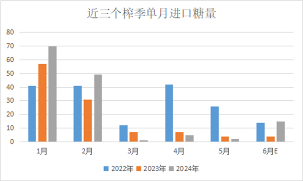 5月食糖進(jìn)口量創(chuàng)下了2萬(wàn)噸的地量,3-5月的累計(jì)進(jìn)口量?jī)H有8萬(wàn)噸,預(yù)計(jì)國(guó)內(nèi)加工糖庫(kù)存也消耗得差不多了,在一定程度上減輕了三季度巨量進(jìn)口帶來(lái)的沖擊。6月預(yù)計(jì)進(jìn)口量在15-20萬(wàn)噸左右,略有恢復(fù),但依然偏少。進(jìn)口糖源的大量補(bǔ)充預(yù)計(jì)在7月下旬甚至8月中旬后,如果進(jìn)口糖源補(bǔ)充延后,利多方面是在本榨季期間國(guó)產(chǎn)糖將維持定價(jià)優(yōu)勢(shì),利空方面則是新榨季的開局或?qū)B加增產(chǎn)+進(jìn)口糖上市的兩重利空因素。