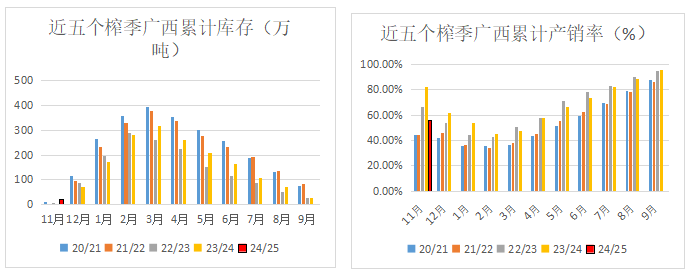 至11月底廣西共產(chǎn)混合糖51.24萬(wàn)噸,同比增加43.86萬(wàn)噸;混合產(chǎn)糖率10.92%,同比提高1.50個(gè)百分點(diǎn);累計(jì)銷糖28.50萬(wàn)噸,同比增加22.46萬(wàn)噸;產(chǎn)銷率55.62%,同比下降26.22個(gè)百分點(diǎn)。11月底廣西食糖工業(yè)庫(kù)存22.74萬(wàn)噸,同比增加21.4萬(wàn)噸。可以說(shuō)11月的產(chǎn)量是超出了業(yè)界的預(yù)期,廣西產(chǎn)糖量達(dá)到了有史以來(lái)的第二峰值。銷量也大幅增加,但基本符合業(yè)界產(chǎn)銷兩旺的預(yù)期。總體看,累計(jì)產(chǎn)銷率處于中性水平,廣西累庫(kù)或從11月底開(kāi)始,預(yù)計(jì)生產(chǎn)期間產(chǎn)銷率均難達(dá)到同期的高值,一年一度的年前備貨高峰在12月上旬還看不到明顯放量,銷售的壓力隨著時(shí)間的推移加大。