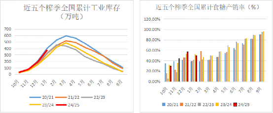 1月廣西已收榨三家糖廠,累計(jì)日產(chǎn)能減少16000噸,2月份預(yù)計(jì)收榨糖廠超過(guò)30家,其中崇左13家糖廠收榨8家,且均是大產(chǎn)能糖企,來(lái)賓預(yù)計(jì)收榨超過(guò)一半。再考慮春節(jié)生產(chǎn)期間的停機(jī)或檢修,預(yù)計(jì)廣西月產(chǎn)量可能比最高產(chǎn)量下降一半或以上。對(duì)銷量依然不悲觀,主要是加工糖難以大量供應(yīng)市場(chǎng),國(guó)內(nèi)依然會(huì)以國(guó)產(chǎn)糖銷售為主,但考慮到連續(xù)三個(gè)月放量,2月的產(chǎn)銷進(jìn)度或?qū)⒎啪彙?傮w看,累庫(kù)進(jìn)度并不算快,國(guó)內(nèi)的產(chǎn)銷節(jié)奏預(yù)計(jì)保持中性偏好。