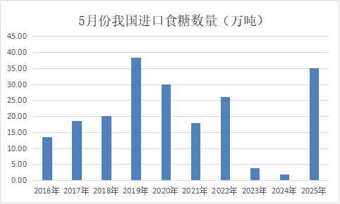 海關總署公布的數據顯示,2025年5月份我國進口食糖35萬噸,同比增加33萬噸,處于近十年同期第二高的水平。其中白糖2.1萬噸,原糖32.66萬噸。