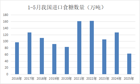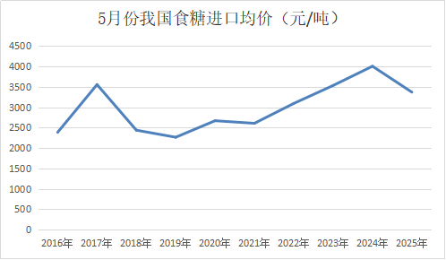 2025年1-5月我國進口食糖均價為3574元/噸(到岸價),雖然同比大幅下降768元/噸,但是仍然處于近十年同期第二高的水平。
