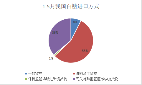 2025年1-5月我國進口食糖63萬噸,其中白糖10萬噸,進口方式主要是進料加工貿易5.56萬噸,其次是海關特殊監管區域物流貨物3.62萬噸,第三是一般貿易只有0.75萬噸;原糖53萬噸,大部分33萬噸為保稅監管場所進出境貨物,其次約20萬噸通過一般貿易進口。5月份進口的約33萬噸原糖大部分27萬噸為保稅監管場所進出境貨物,只有6萬噸通過一般貿易進口。
