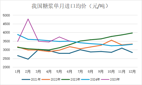 6月份我國進口糖漿三項合計5.01萬噸,進口均價3495元/噸,同比基本持平,折糖價約5216元/噸。