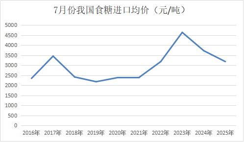 7月份我國進口食糖均價為3186元/噸(到岸價),同比下降541元/噸,繼續保持在近三年同期最低水平。