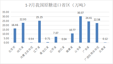 2025年1-7月我國累計進口食糖179萬噸,其中白糖16.84萬噸,主要為遼寧進口4.2萬噸,其次為廣東3.85萬噸,第三山東、北京均為2.5萬噸左右;原糖161.25萬噸,其中山東進口最多30萬噸,其次遼寧、廣東均為25萬噸左右,第三河北、廣西均為約23萬噸,還有北京16.64萬噸、福建10.77萬噸以及江蘇7萬噸。7月份進口的約70萬噸原糖其中河北16萬噸、廣西14萬噸、遼寧10萬噸、廣東9萬噸、山東8萬噸、福建和江蘇均為5-6萬噸、北京2萬噸,基本上沿海加工廠均有原糖報關。